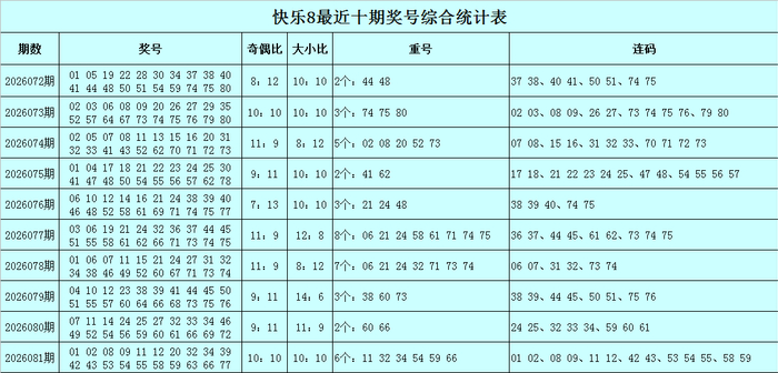 福彩舒畅8第2026081期开出奖号:01 02 08 09 11 12 20 32 34 39 42 43 53 54 55 58 59 63 66 77,其中奖号奇偶比为10:10,大小比为10:10,包含6个重号11、32、34、54、59、66,包含连码01 02、08 09、11 12、42 43、53 54 55、58 59。