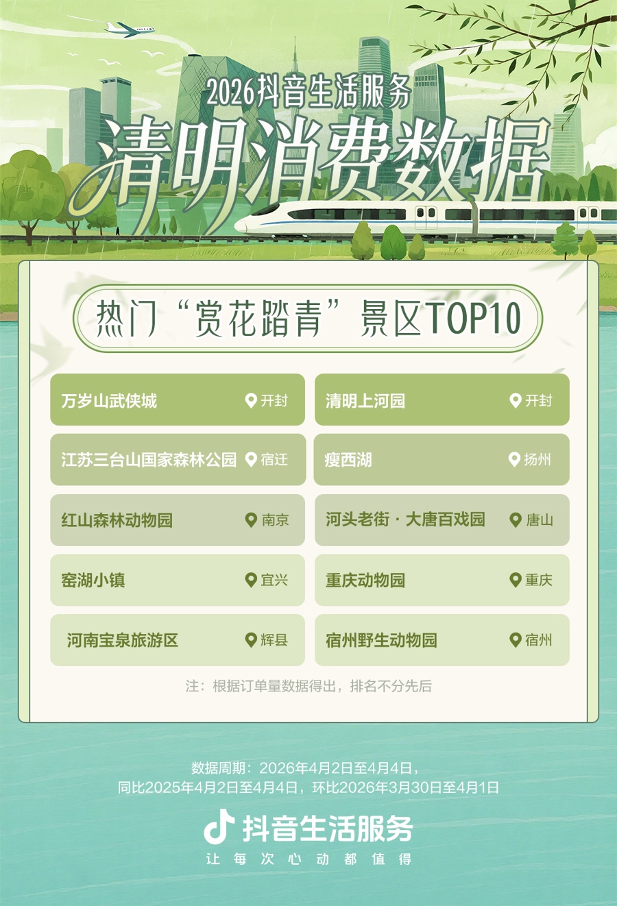 “赏花踏青”景点迎来客流岑岭。晴明假期,抖音景区团购订单量环比增长98%。开封万岁山武侠城、开封晴明上河园、江苏三台山国度丛林公园、扬州瘦西湖、南京红山丛林动物园、唐江山头老街·大唐散乐土等入围“10大热门赏花踏青景点”。返乡祭祖带动抖音乡村景点订单量环比增长157%,上饶婺源篁岭征象区、枣庄台儿庄古城、保定易县狼牙山原野花海、铜陵犁桥水镇、湖州太湖演艺城入围“5大热门乡村处所地”。