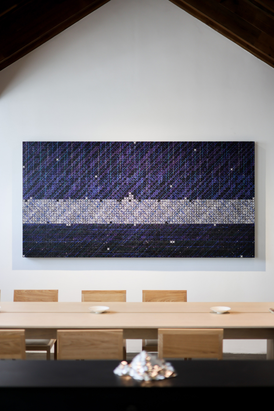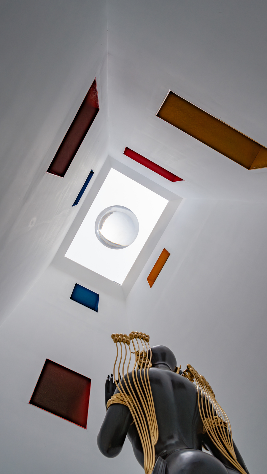 在确保历史建设获得无缺保护、全部修订可逆的前提下,建设师还将眼神投向旧居中心十米通高的中庭,将其与青藏建设传统的中心空间谋划起来,将喜马拉雅地区文化中高迷漫度的颜色索要为轮廓切片,涂刷围绕中庭时势互异的内向窗洞,并置入无框天窗中心,鼓动这座庸俗生存空间逶迤为谛视现代文化的精神场域。中庭内则是雕刻家蒋晟以西藏传统文化为灵感创作的雕刻《八万四千年》。通过验证,修订团队还在三楼屋顶中收复了原始板屋架,运用回收的旧木柴复兴历史操心。