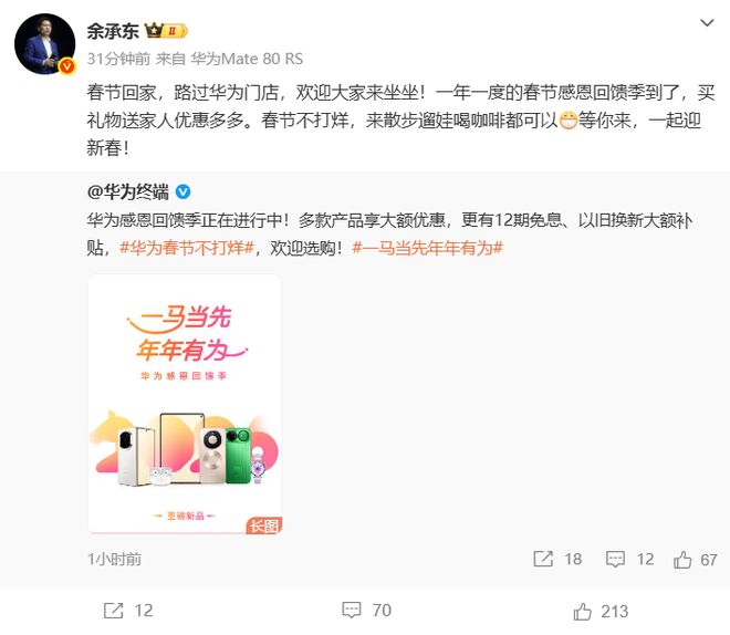1月29日,金牛配资网余承东转发“华为终端”微博并表示,华为一年一度的春节感恩回馈季到了,买礼物送家人优惠多多。春节不打烊,来散步遛娃喝咖啡都可以等你来,一起迎新春!