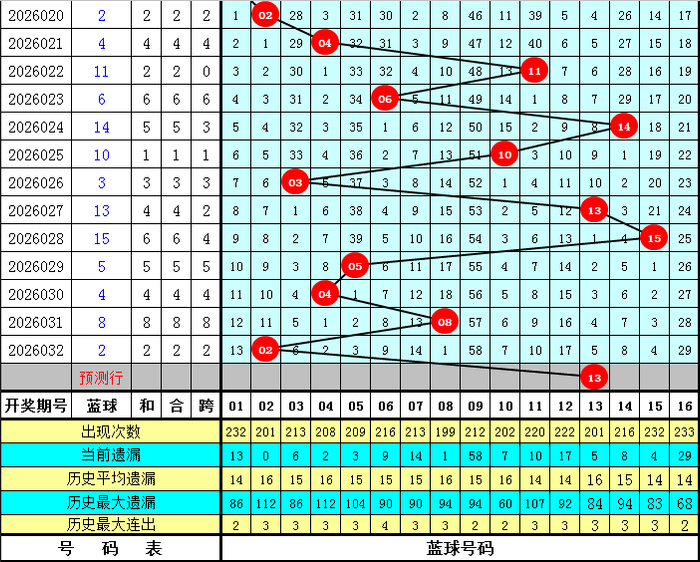 蓝球分析:上期蓝球开出号码02,与前期对比下落6个点位,最近10期蓝球号码大小比为4:6,本期能干大号蓝球回补,参考蓝球13。
