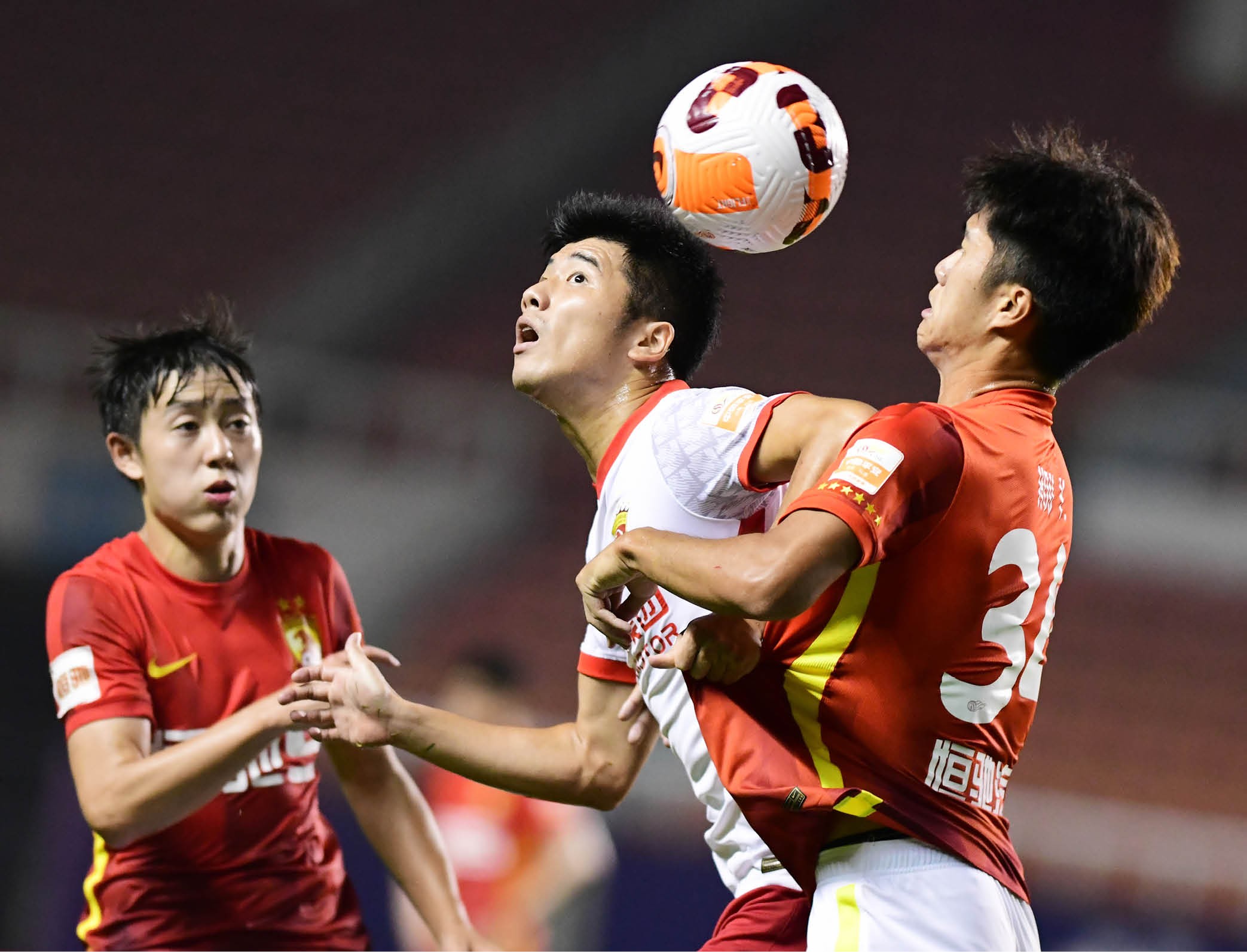 2022中超联赛第9轮,广州队VS上海海港,李圣龙(中)在争顶头球。