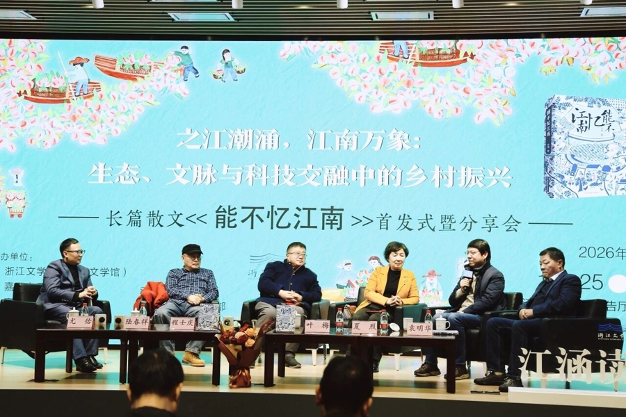 “浙江是文学沃土,也是生态文明建设的重要实践地,《能不忆江南》正是对这片土地最深情的凝视与最诗意的解读。”1月25日,由浙江教育出版社出版、作家叶梅新作长篇散文《能不忆江南》新书首发式暨分享会在杭州浙江文学馆举行。浙江文学馆馆长程士庆表示,本书不仅是一部文学作品,更是一幅展现“绿水青山就是金山银山”生动实践的文学长卷,是浙江生态文明成就的深情写照,也是中国乡村振兴之路的文学表达。
