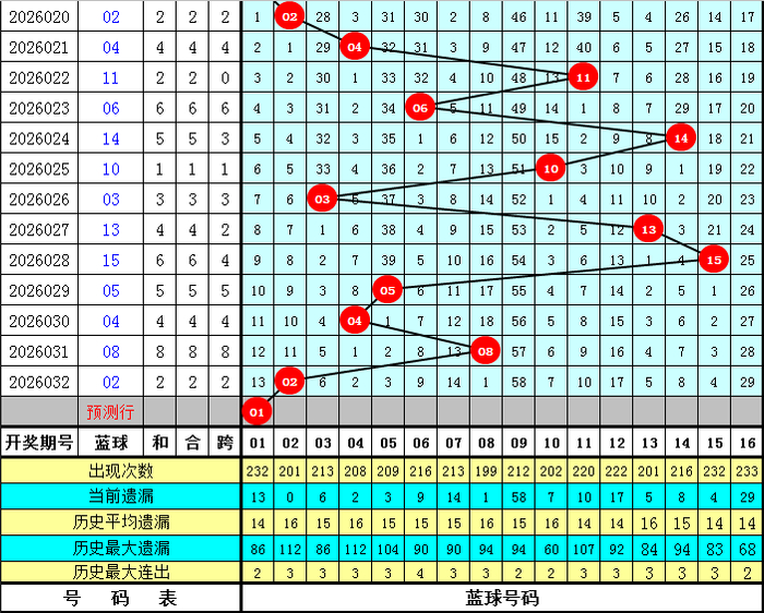 蓝球号码分析:上期蓝球为02,开出2路号码,蓝球最近10期012路比为3:3:4,最近30期012路比为6:17:7,最近100期012路比为28:44:28,本期蓝球看好1路号码,四码蓝球参考01、04、10、16。