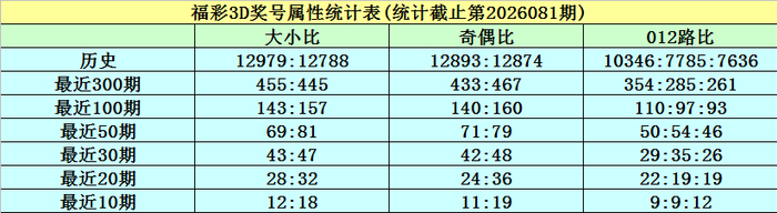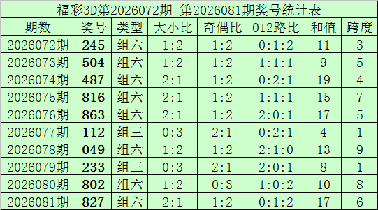 开奖回归:福彩3D第2026081期奖号为827,其中奖号大小比为2:1,奇偶比为1:2,012路比为0:1:2,和值为17,跨度为6。