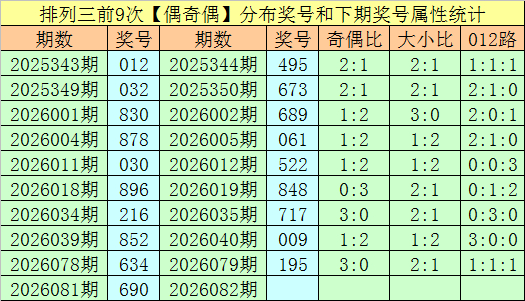 上期归来:胪列三第2026081期开出奖号690,类型为:偶奇偶、000路和大大小。
