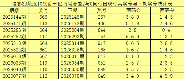 从以上统计不错看出,百个位两码合差9与7同期出现之后其下期两码合差弘扬最热的4个永诀为:0135,本期百个位两码合差不错参考这四码中的数据。