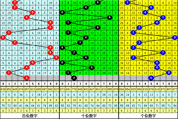 百个位合差分析:上期奖号百个位开出18组合,两码合为9,两码差为7,最近10次百个位两码合9与两码差7同期出面前,其奖号和下期奖号永诀为:
