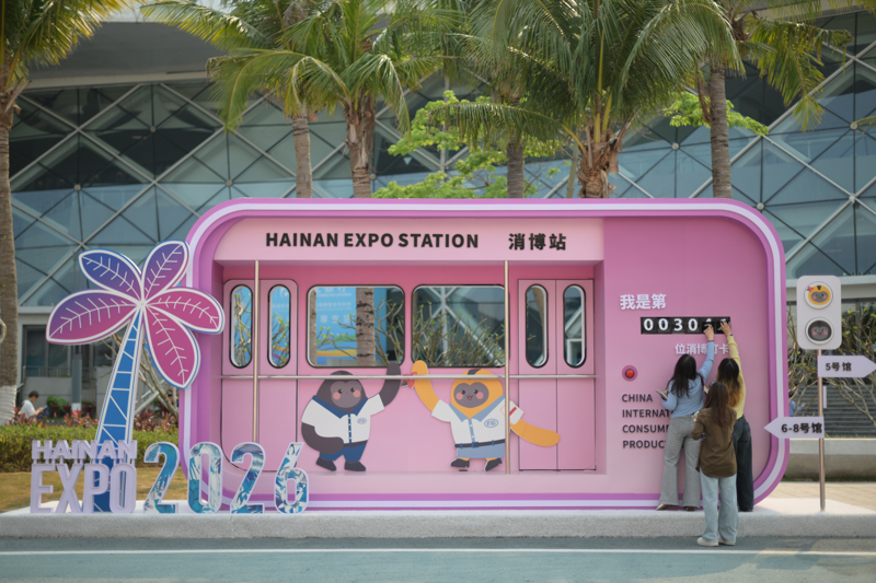 参不雅者在主会场海南国外会展中心外打卡。新华社记者 辛悦卫 摄