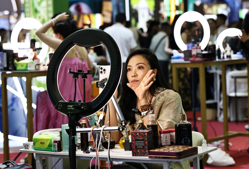 主播在化妆品展台直播。新华社记者 高静 摄