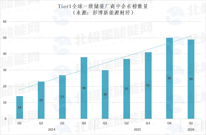 从图中可以看出,2024年全年中企在榜数目稳步高涨,第四季度呈爆发式增长;2025年第一季度虽比拟前一季度有所着落,但全年仍处高涨态势,且第四季度达到历史最高;2026年第一季度较上一季度微有着落,但较2024年第一季度同比增长250%,较2025年第一季度同比增长63.3%,体现出中国企业在储能限度环球竞争力抓续普及。