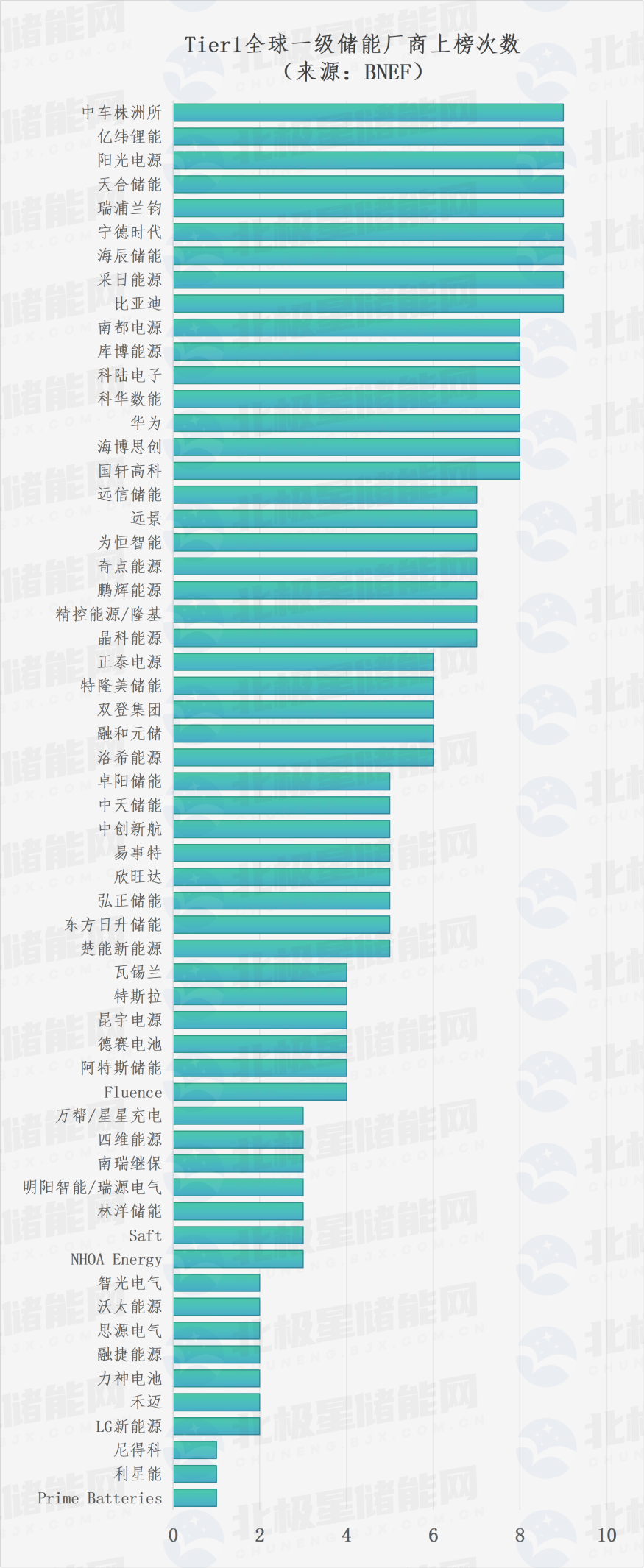 北极星储能网不雅察到,自2024年第一季度Tier 1榜单推出以来,包含比亚迪、采日动力、海辰储能、宁德期间、瑞浦兰钧、天合储能、阳光电源、亿纬锂能(维权)、中车株洲方位内的9家企业9次榜单恒久在列,无一次落榜。