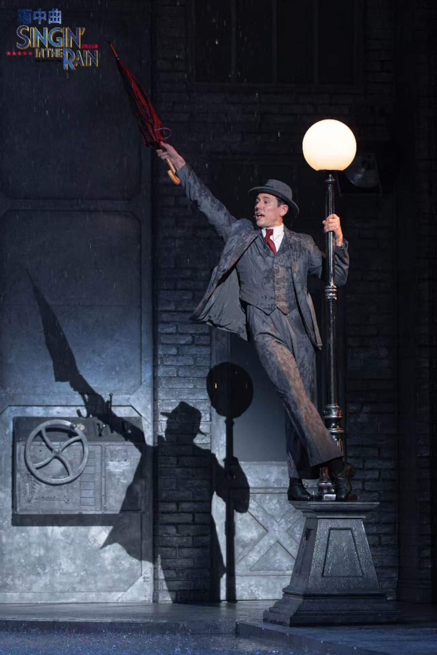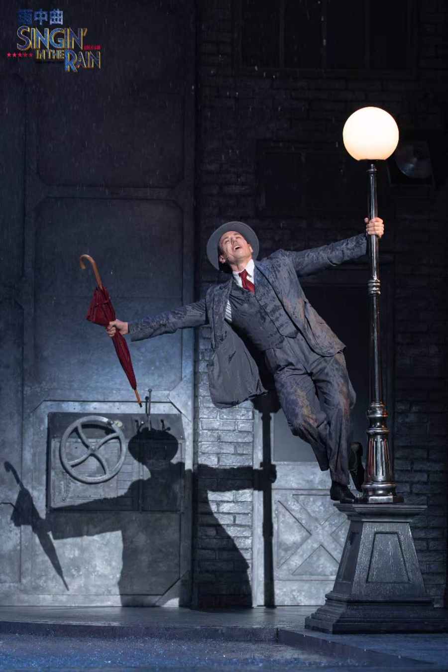 不同于一般音乐剧乐队会放在台前,《雨中曲》里的踢水戏份,容易淋湿乐器,是以乐队安排在舞台后方,中间玄色帘子献技时会升降1到2次,不雅众有契机和乐手打呼叫。