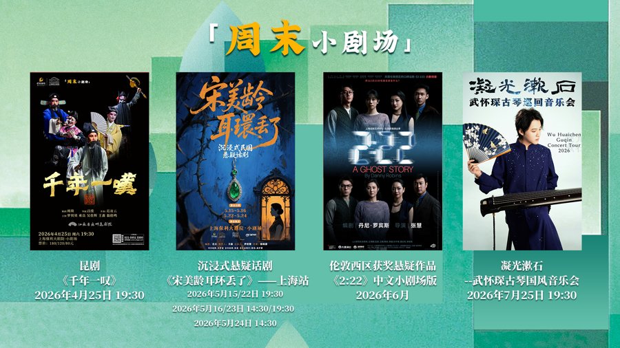 在周末小戏院则有苏州昆剧院《千年一叹》、千里浸式悬疑话剧《宋好意思龄的耳饰丢了》,上海话剧艺术中心出品制作悬疑剧《2:22》、武怀琛古琴国风音乐会等。