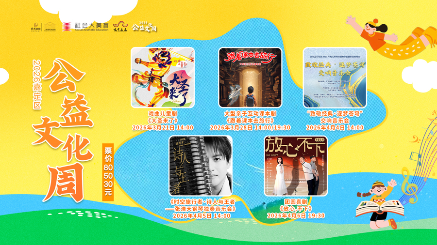 由嘉定区文化和旅游局主理、上海保利大剧院经办的2026嘉定区“公益文化周”,3月21日-4月6日将带来5台6场上演,涵盖戏曲儿童剧《大圣来了》、大型亲子互动讲义剧《随着讲义去旅行》、“致意经典·逐梦天穹”交响音乐会、张浩天钢琴独奏音乐会和团圆笑剧《宽心,不下》。