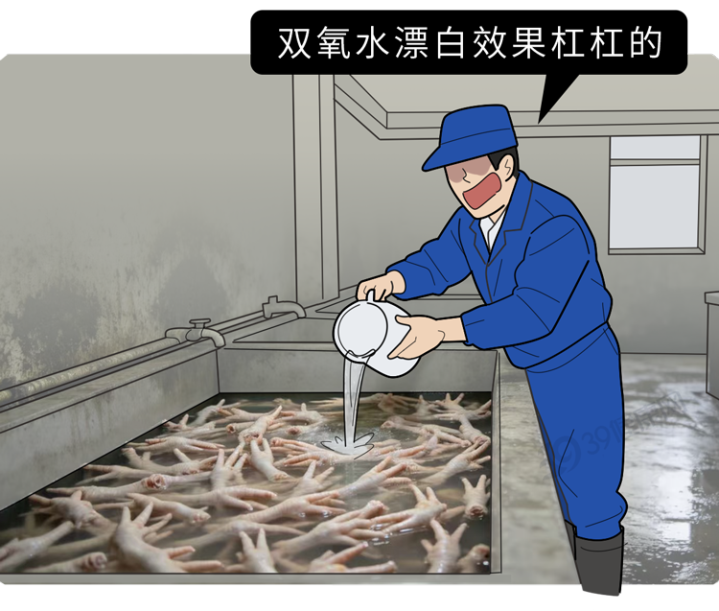 而为了让鸡爪卖相更顺眼,还用双氧水(过氧化氢)浸泡。双氧水具有强氧化性,能腐蚀表皮,让凤爪俄顷“好意思白”,呈现出一种病态的煞白。