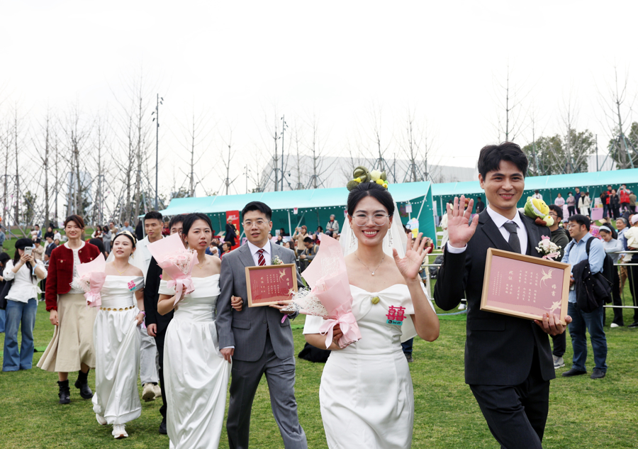 双子山大草坪上,百对新东说念主举行集体婚典。
