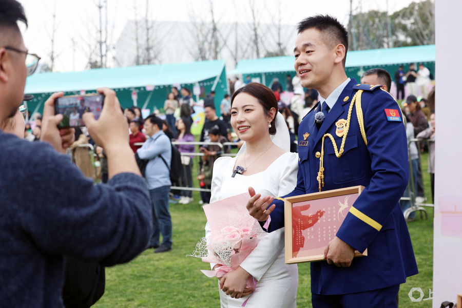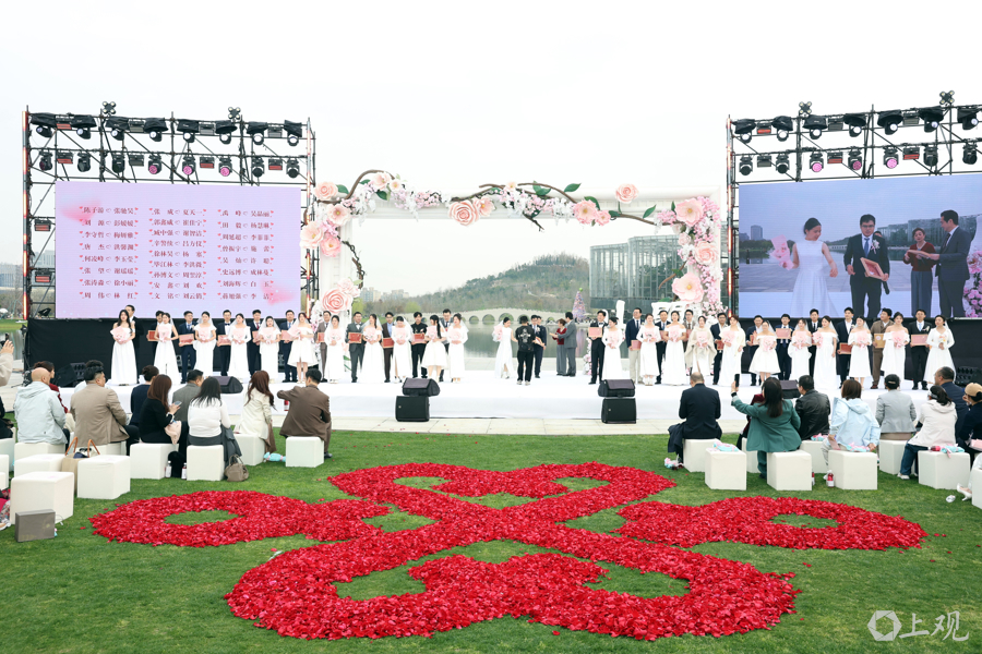 百对新东说念主挨次登台,在“爱情见证官”的跟随下领取婚书。