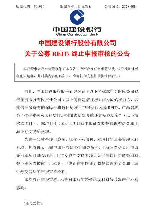 1月23日,建设银行公告称,前期,该行附属公司建信住房作为原始权益人,以建信住房持有的保障性租赁住房项目申报发行公募REITs。该项目于2024年3月获中国证券监督管理委员会和上海证券交易所受理。为进一步整合项目资源,优化运营管理,该项目的基金管理人和专项计划管理人主动申请撤回申报材料。截至2026年1月23日,该项目已终止申报审核流程。